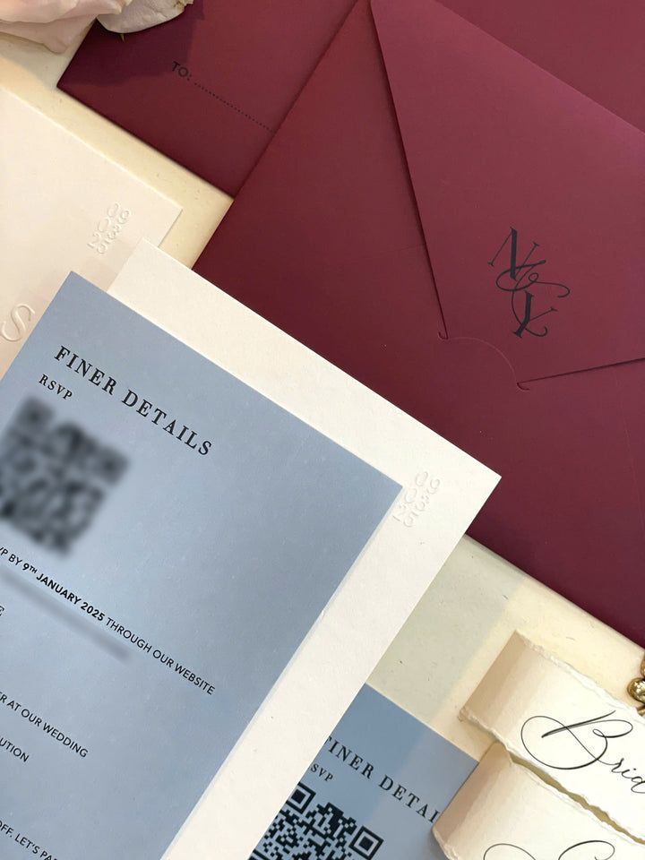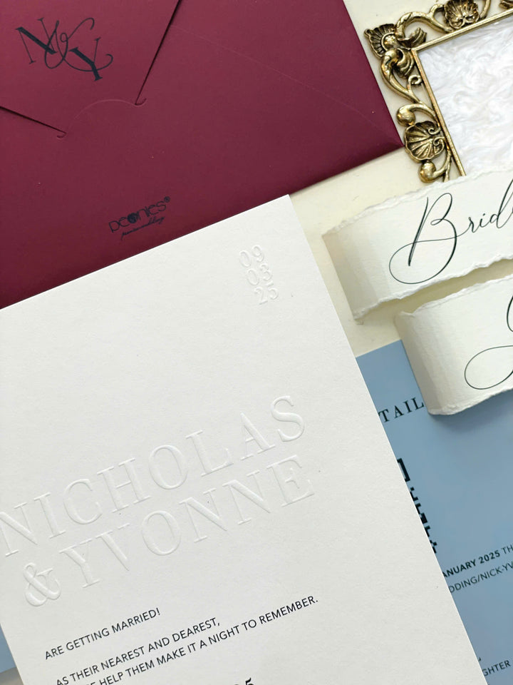 – Increase luxury and impression with technology: Metalic/Foil, Embossing, Debossing/Letterpressing, Double-thick on paper, Wax seal, Ribbon, Dried Flowers...
