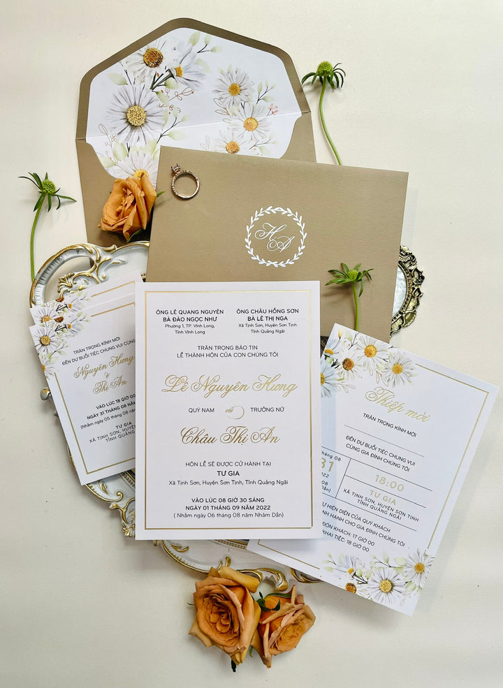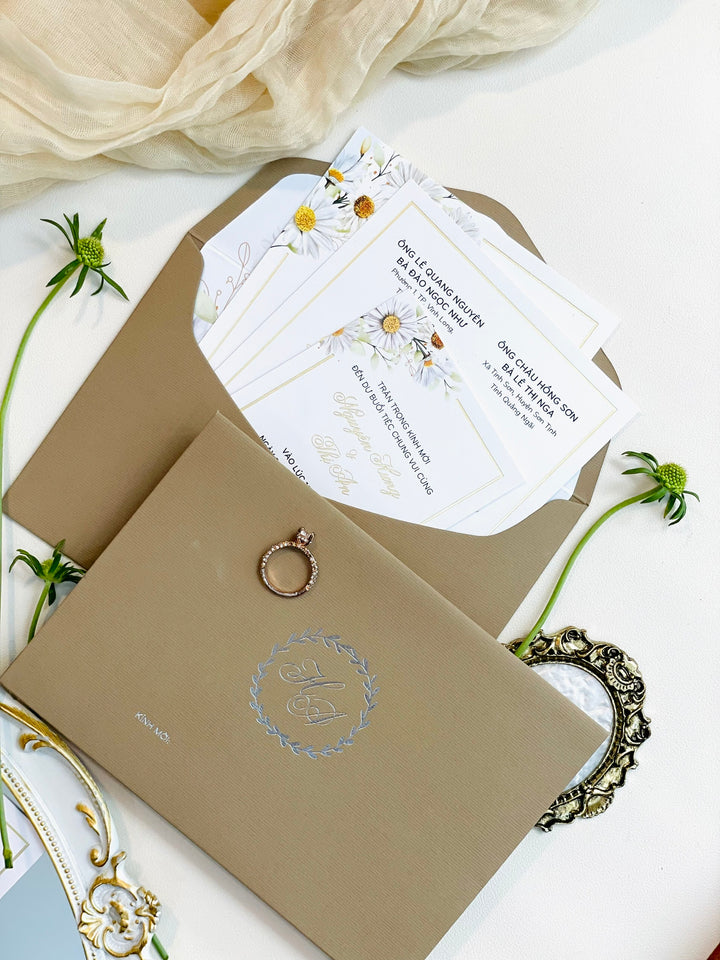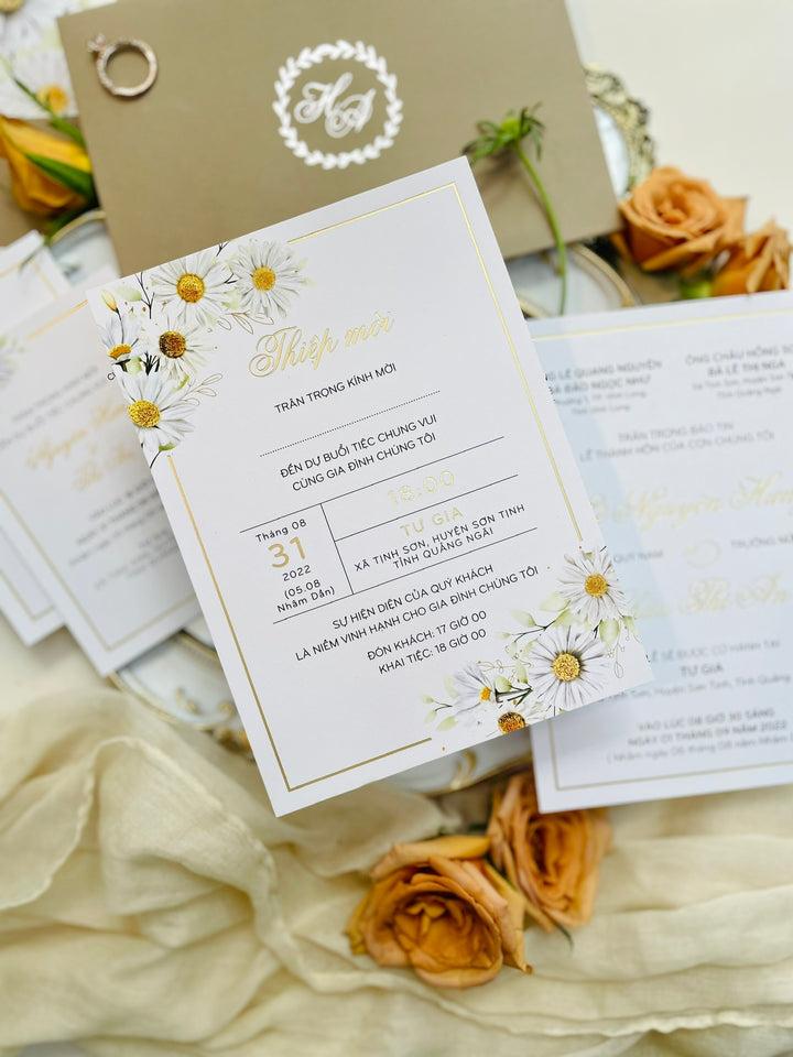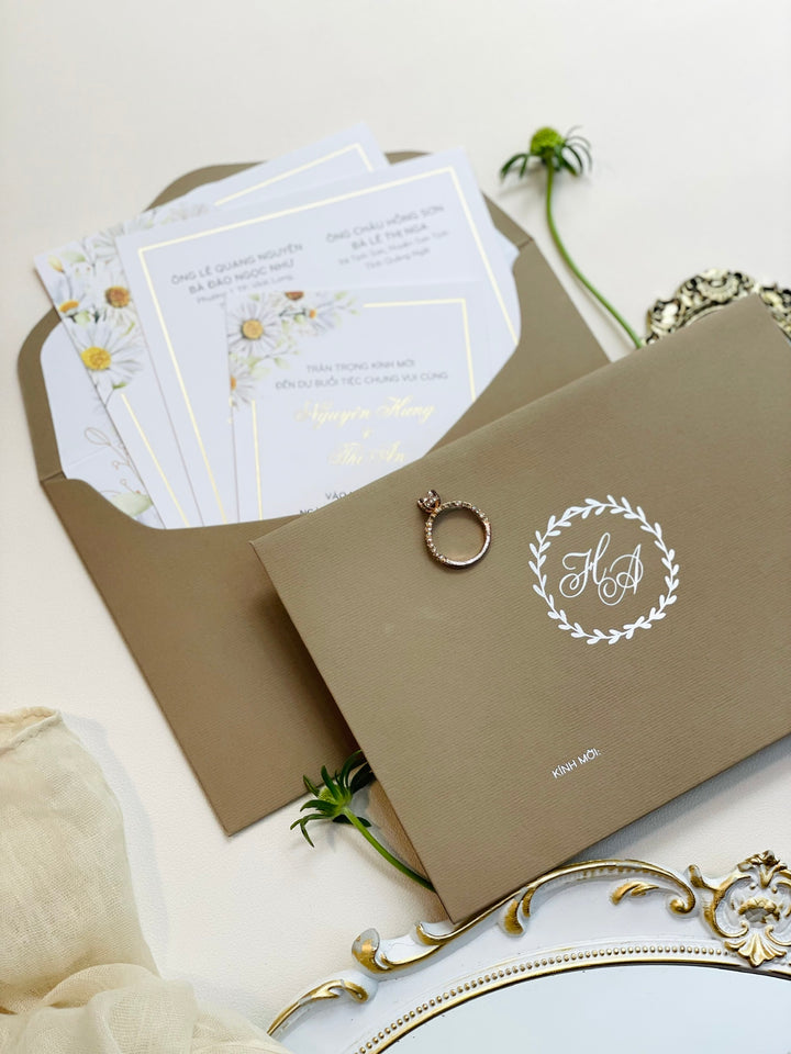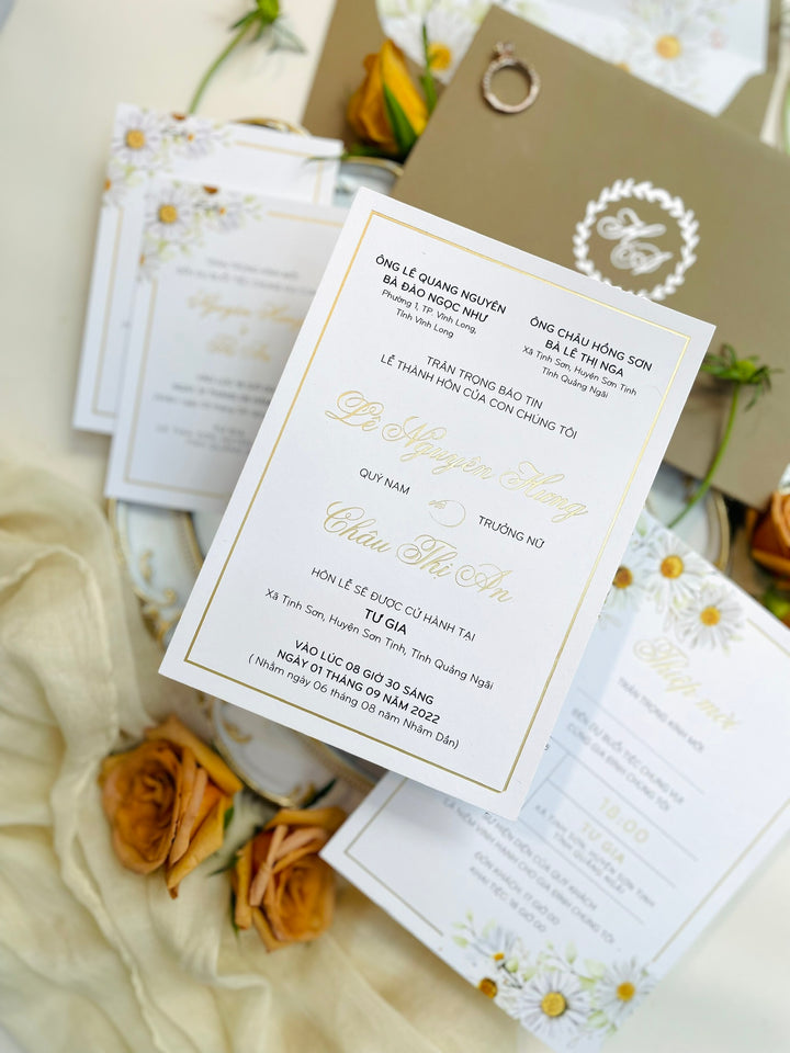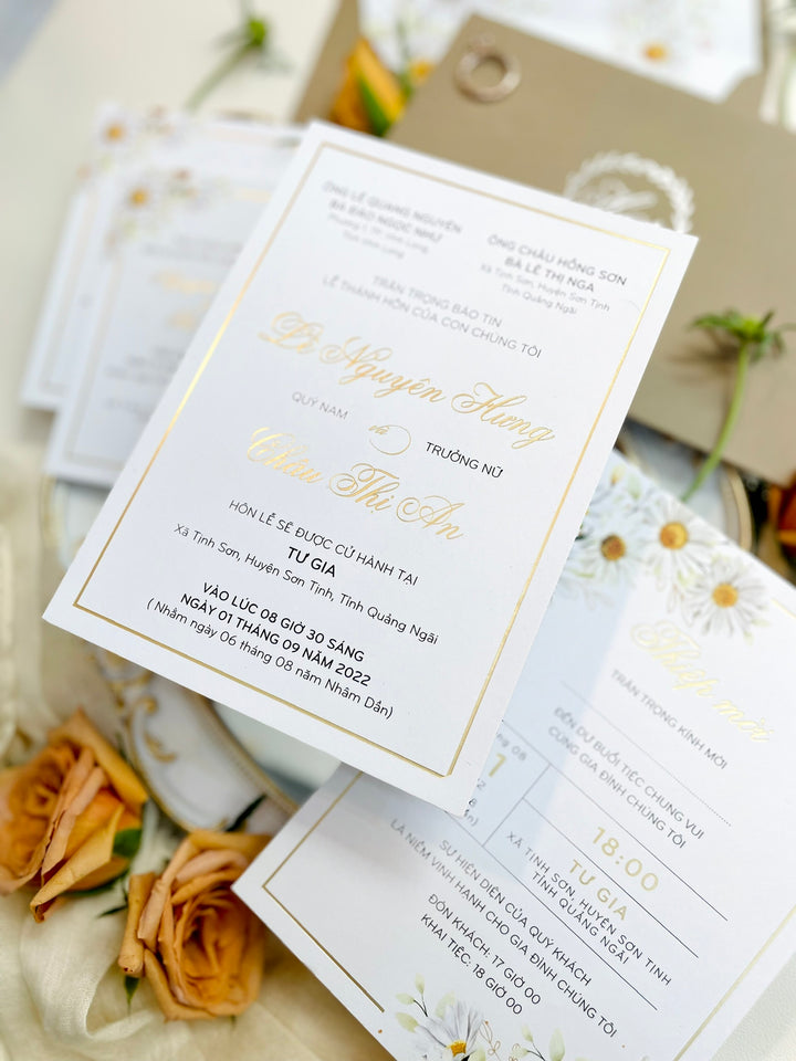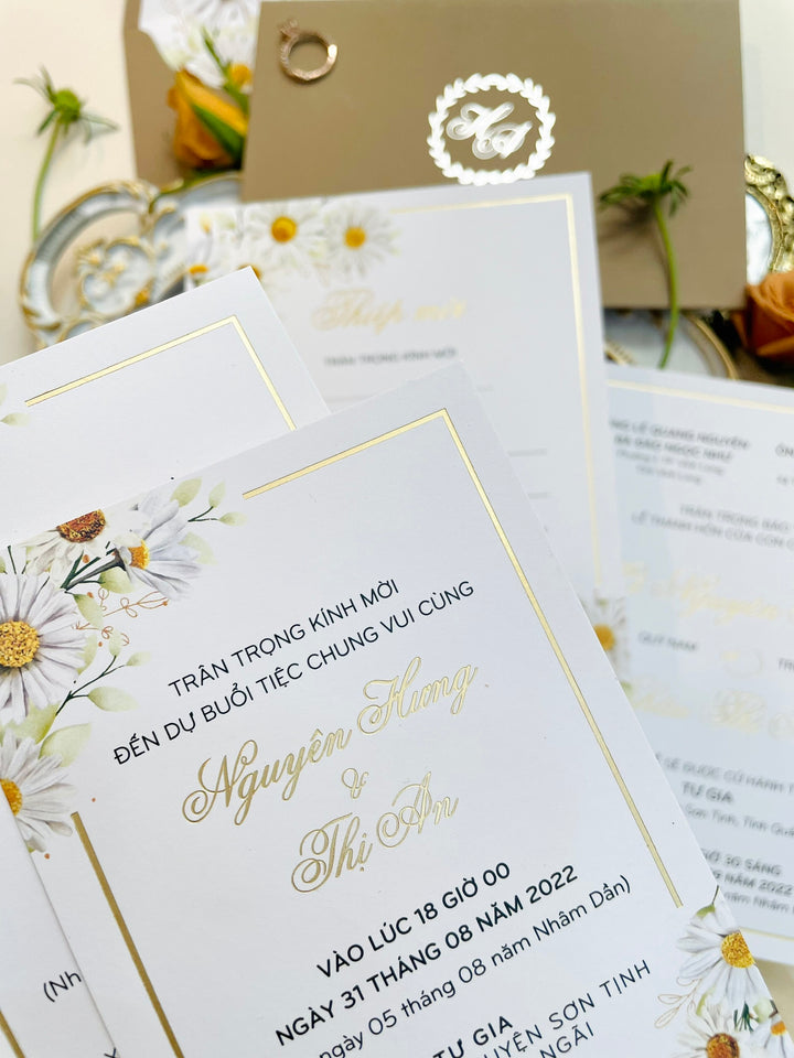 – Increase luxury and impression with technology: Metalic/Foil, Embossing, Debossing/Letterpressing, Double-thick on paper, Wax seal, Ribbon, Dried Flowers...